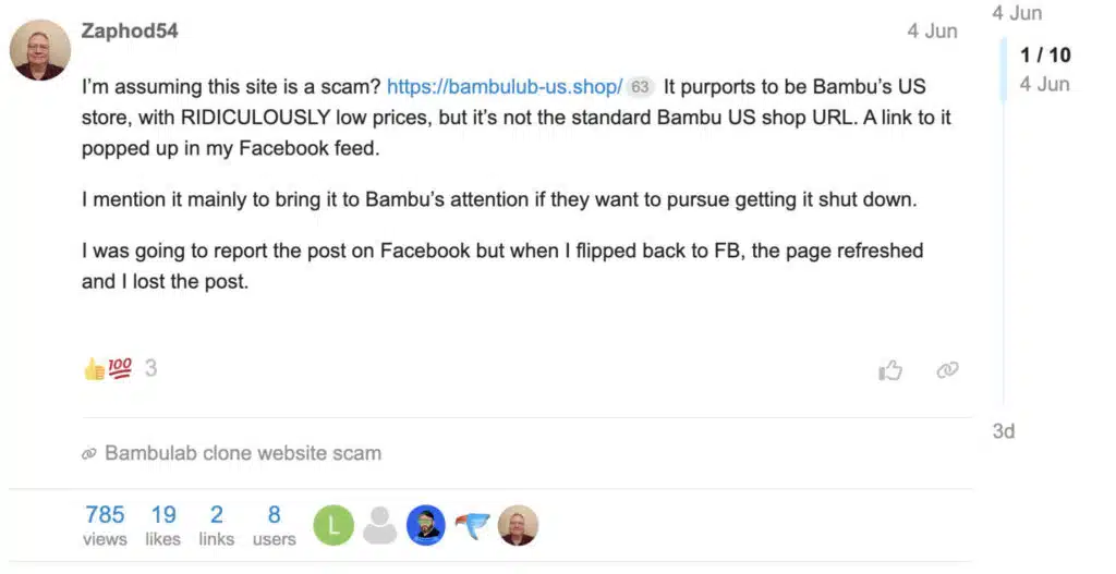 Ma non è tutto qui. I truffatori sfruttano anche la pubblicità a pagamento su Facebook e Instagram, piattaforme di Meta, creando inserzioni che sembrano campagne ufficiali di Bambu Lab. Alcune pubblicità mostrano link che sembrano portare al sito vero (bambu.com), ma in realtà reindirizzano a domini falsi, come bamboo-3d.com, completamente estranei all’azienda.